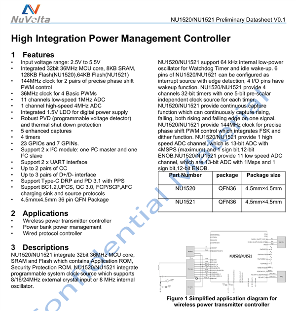 协议芯片来自伏达半导体,型号NU1520,芯片内部集成32位MCU,主频为36MHz,集成128KB FLASH和8KB SRAM,具备无线充电驱动信号输出,芯片内置11通道低速ADC和单通道高速ADC,内部集成1.5V LDO。